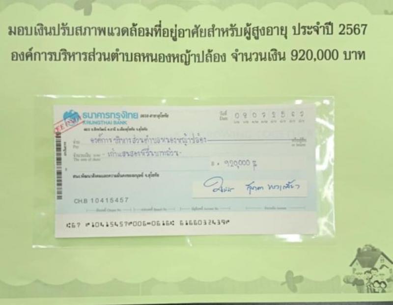 รายละเอียด : องค์การบริหารส่วนตำบลหนองหญ้าปล้องโดยร้อยตำรวจเอกทองสุข เหล่าทองสาร นายกองค์การบริหารส่วนตำบลรับมอบเงินปรับสภาพแวดล้อมที่อยู่อาศัยสำหรับผู้สูงอายุ ประจำปี ๒๕๖๗ ตามโครงการสร้างสภาพแวดล้อมที่เอื้อต่อสุขภาวะทางด้านร่างกายและจิตใจแก่ครัวเรือนเปราะบาง เฉลิมพระเกียรติพระบาทสมเด็จพระเจ้าอยู่หัวเนื่องในโอกาสมหามงคลเฉลิมพระชนมพรรษา ๖ รอบ ๒๘ กรกฎาคม ๒๕๖๗ จากนายสุชาติ ทีคะสุข ผู้ว่าราชการจังหวัดสุโขทัย จำนวนเงิน ๙๒๐,๐๐๐ บาท จำนวน ๒๓ หลัง