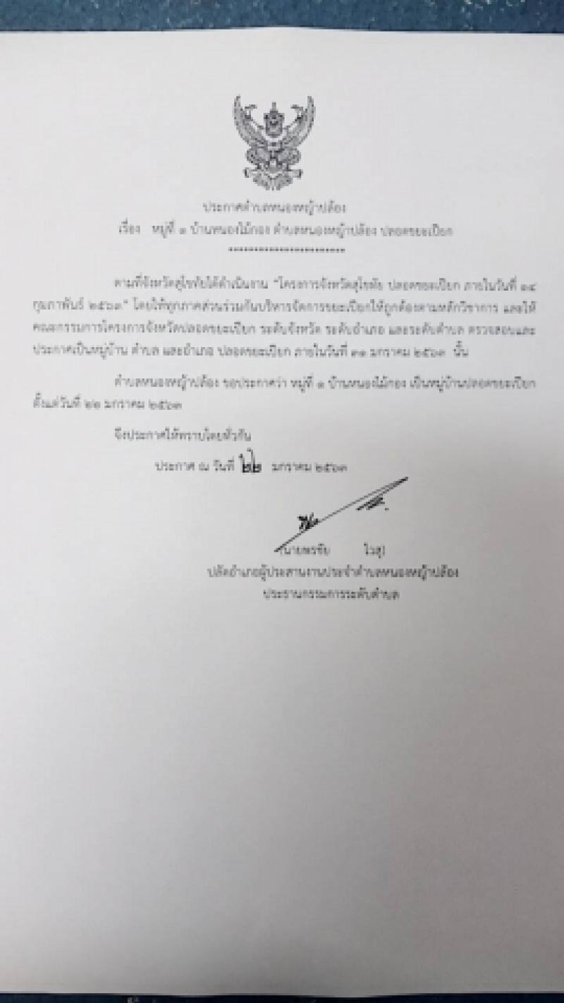 ขอประกาศว่า หมู่ที่ 1 บ้านหนองไม้กอง เป็นหมู่บ้านปลอดขยะเปียก ตั้งแต่วันที่ 22 มกราคม 2563