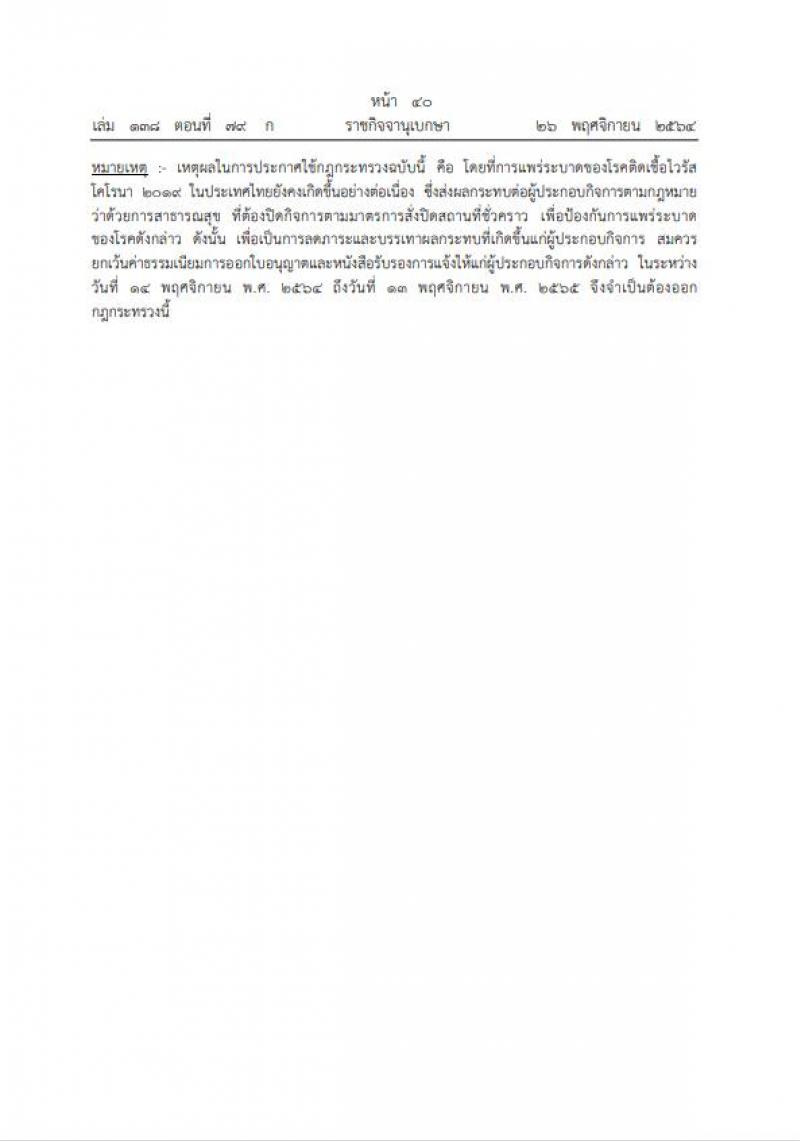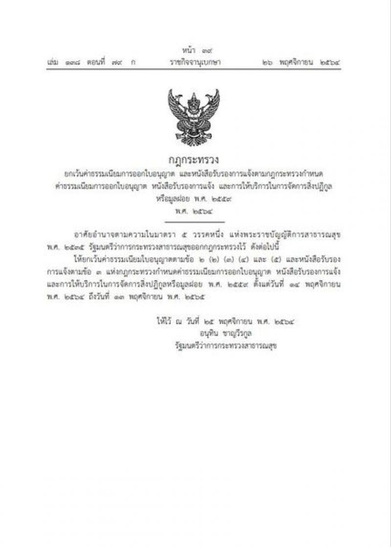 รายละเอียด : ประกาศ การยกเว้นค่าธรรมเนียมการออกใบอนุญาตและหนังสือรับรองการจ้าง ให้ผู้ประกอบกิจการตาม พ.ร.บ.การสาธารณสุข พ.ศ.2535 เพื่อบรรเทาผลกระทบ จากการแพร่ระบาดโรคติดเชื้อไวรัสโคโรนา 2019 ตามกฎกระทรวง พ.ศ. 2565 ระยะเวลา 1 ปี ตั้งแต่วันที่ 14 พฤศจิกายน พ.ศ. 2564 ถึงวันที่ 13 พฤศจิกายน พ.ศ. 2565