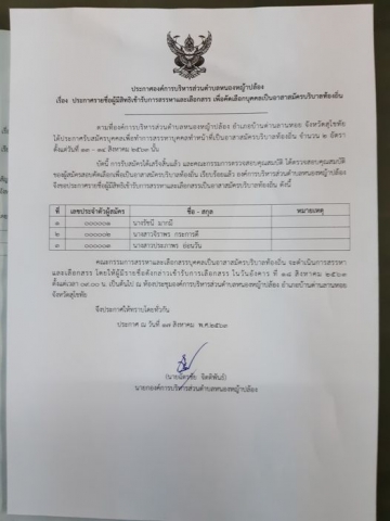 ประกาศองค์การบริหารส่วนตำบลหนองหญ้าปล้อง เรื่อง ประกาศรายชื่อผู้มีสิทธิเข้ารับการสรรหาและเลือกสรร เพื่อคัดเลือกบุคคลเป็นอาสาสมัครบริบาลท้องถิ่น