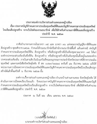 ประกาศบัญชีกำหนดราคาประเมินทุนทรัพย์ที่ดินและบัญชีกำหนดราคาประเมินทุนทรัพย์ โรงเรือน สิ่งปลูกสร้าง จากเว็บไซต์ของกรมธนารักษ์ เพื่อใช้สำหรับคำนวนภาษีที่ดินและสิ่งปลูกสร้าง ประจำปี พ.ศ.2563