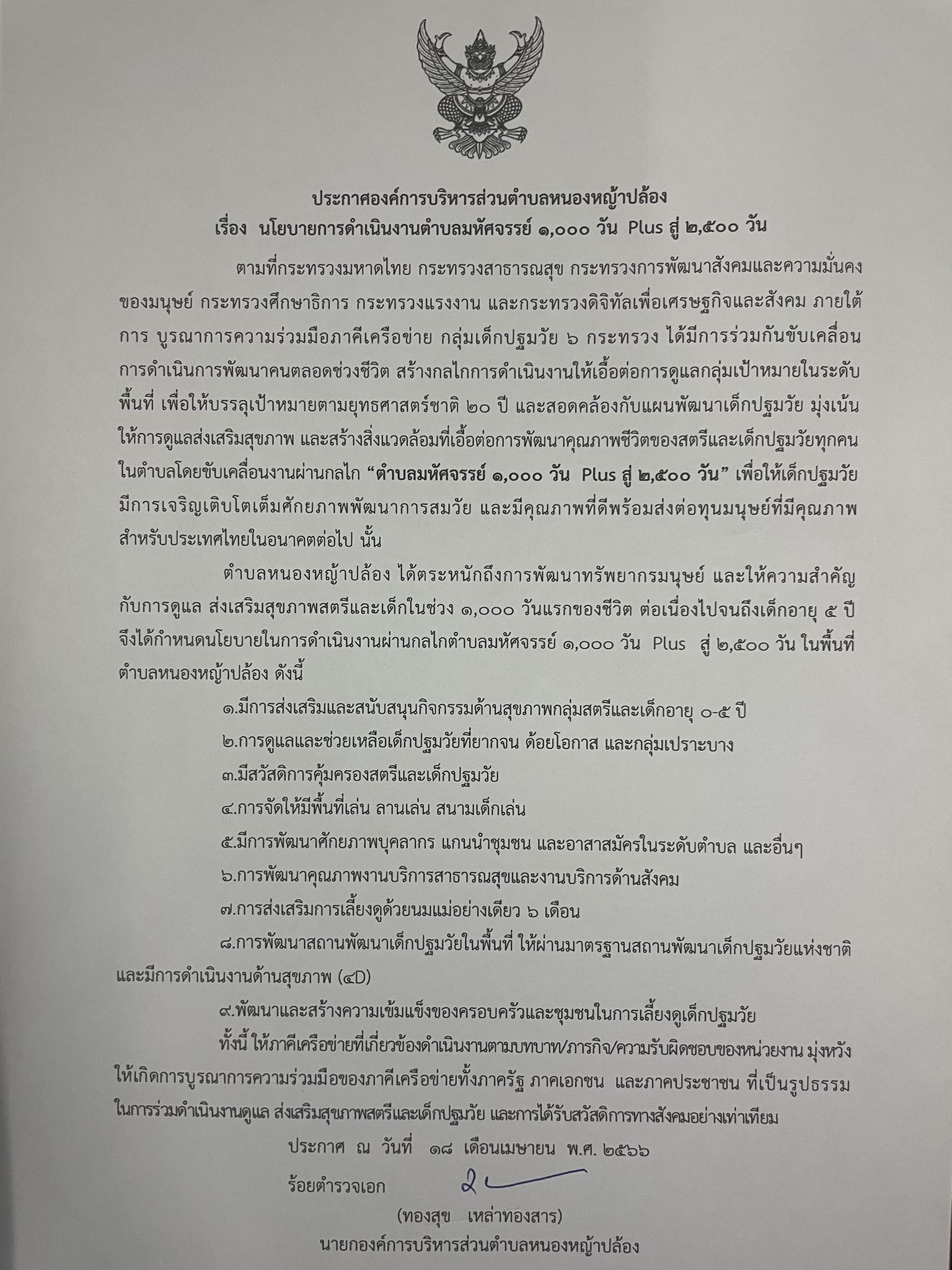 ประกาศองค์การบริหารส่วนตำบลหนองหญ้าปล้อง เรื่อง นโยบายการดำเนินงานตำบลมหัศจรรย์ 1,000 วัน Plus สู่ 2,500 วัน