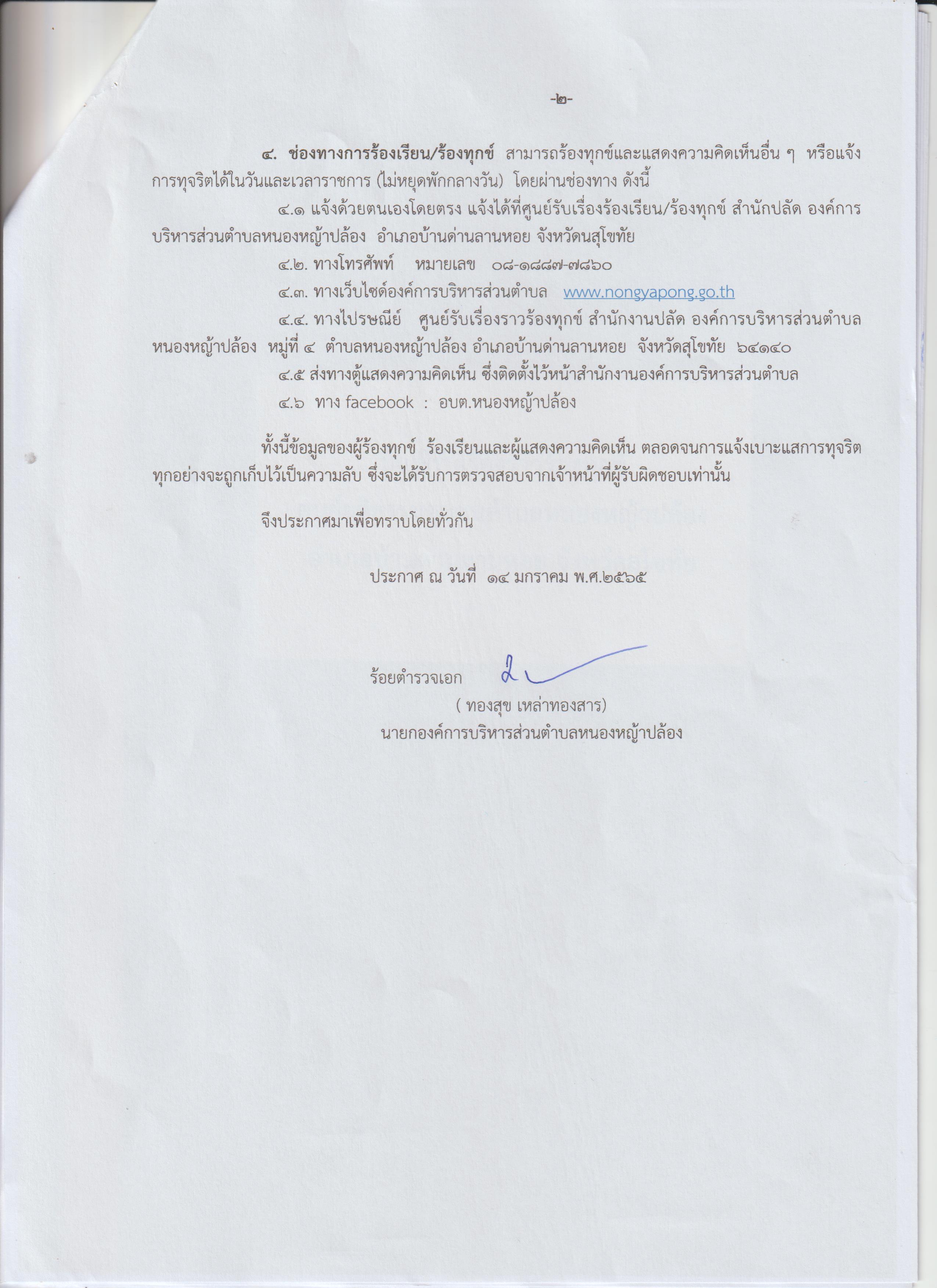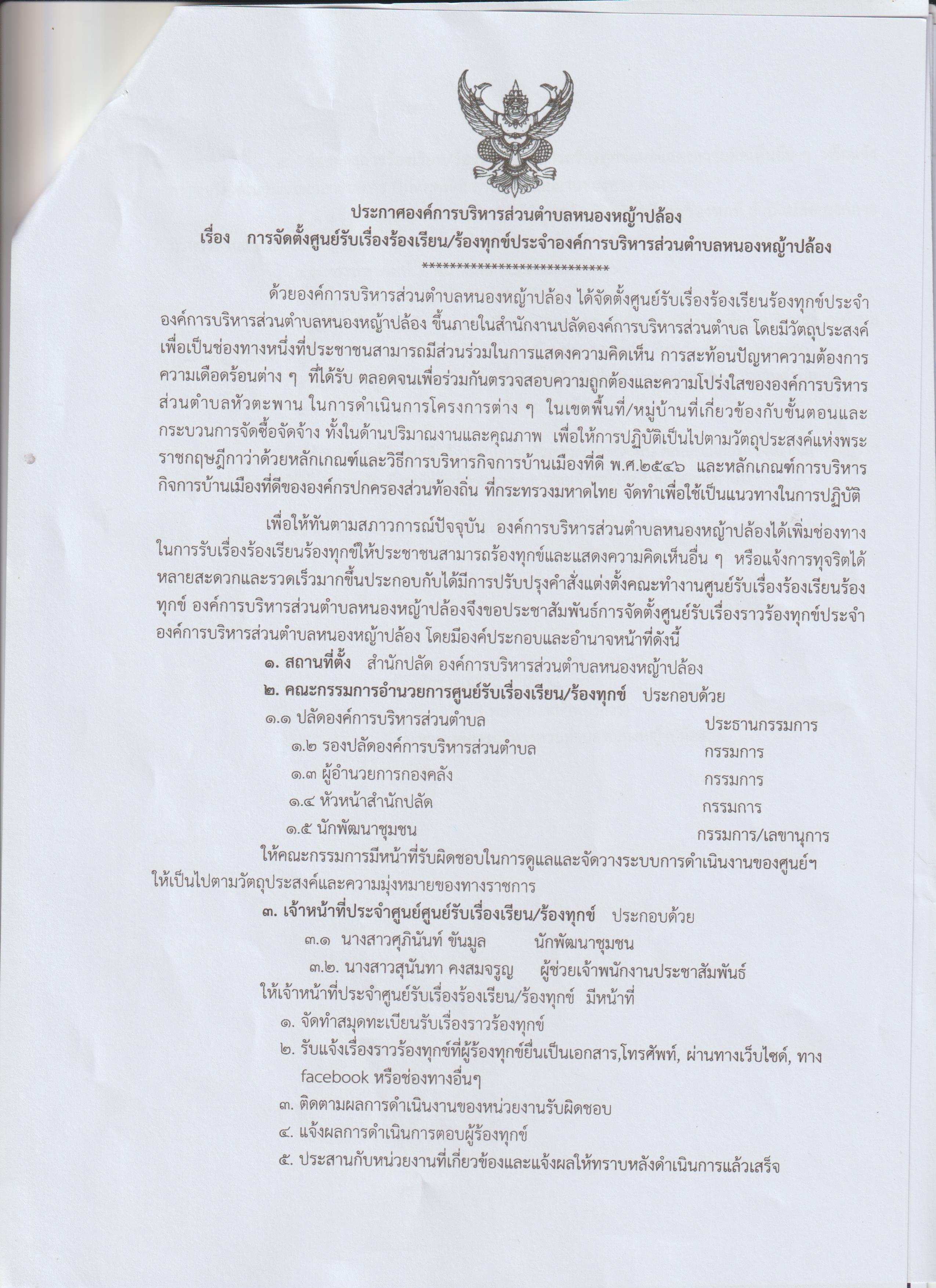 ประกาศองค์การบริหารส่วนตำบลหนองหญ้าปล้อง เรื่อง การจัดตั้งศูนย์รับเรื่องร้องเรียน/ร้องทุกข์ ประจำองค์การบริหารส่วนตำบลหนองหญ้าปล้อง