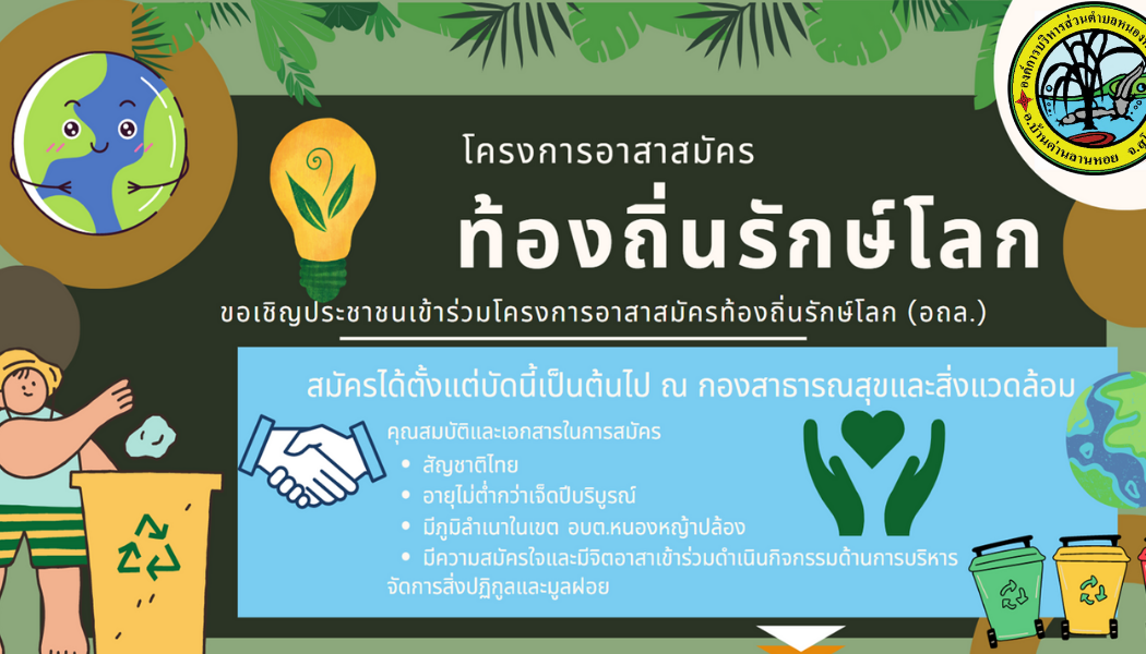 องค์การบริหารส่วนตำบลหนองหญ้าปล้อง ขอเชิญชวนประชาชนเข้าร่วมโครงการอาสาสมัครท้องถิ่นรักษ์โลก (อถล.) คือ บุคคลที่มีความสนใจ มีความสมัครใจมีความเสียสละอุทิศตนในการทำงานด้านการจัดการสิ่งปฏิกูลและมูลฝอย การปกป้องและรักษาสิ่งแวดล้อมในท้องถิ่นของตนเอง ใช้ชื่อย่อว่า (อถล.)