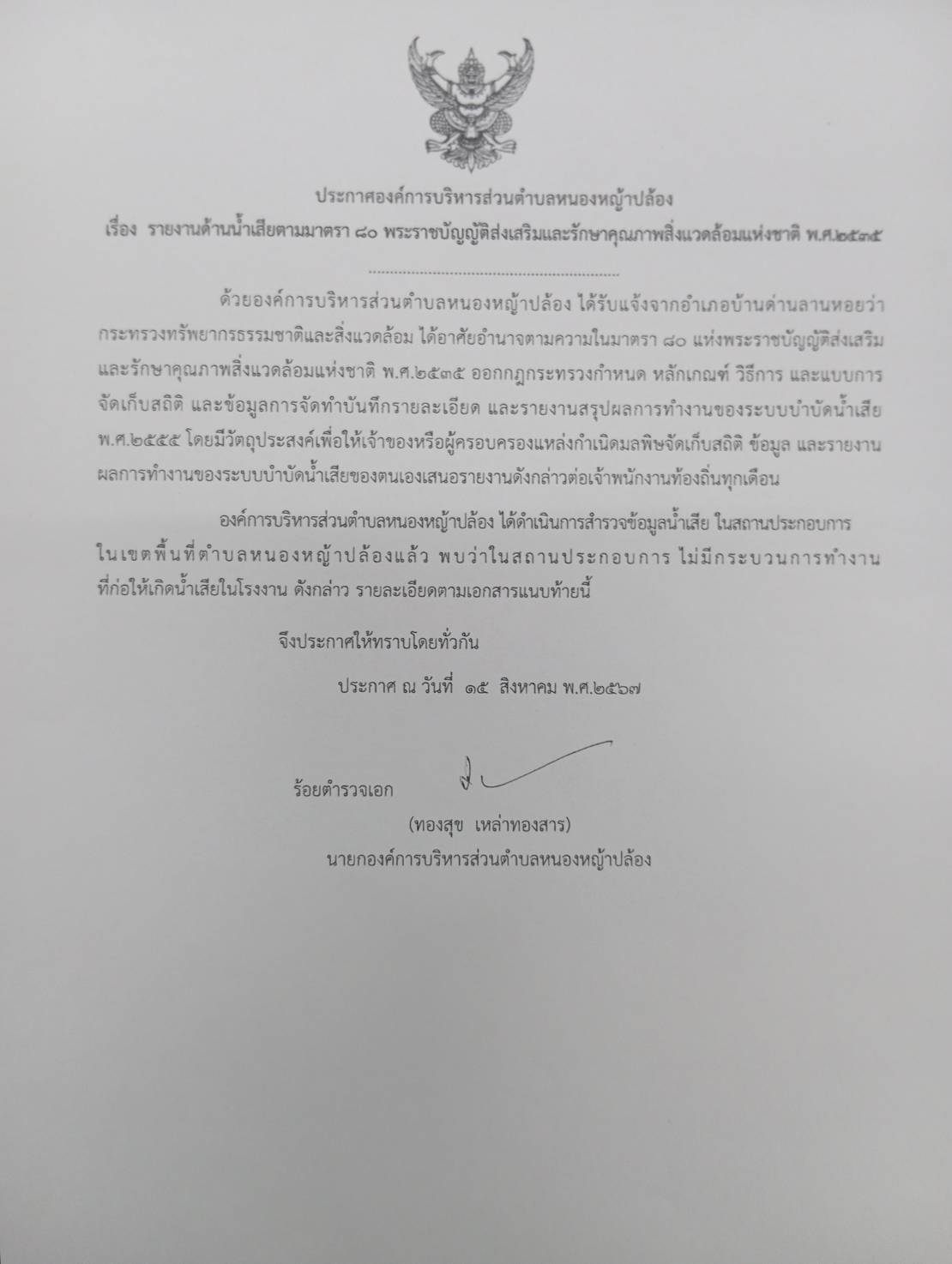 รายงานด้านน้ำเสียตามมาตรา 80 พระราชบัญญัติส่งเสริมและรักษาคุณภาพสิ่งแวดล้อมแห่งชาติ พ.ศ.2535