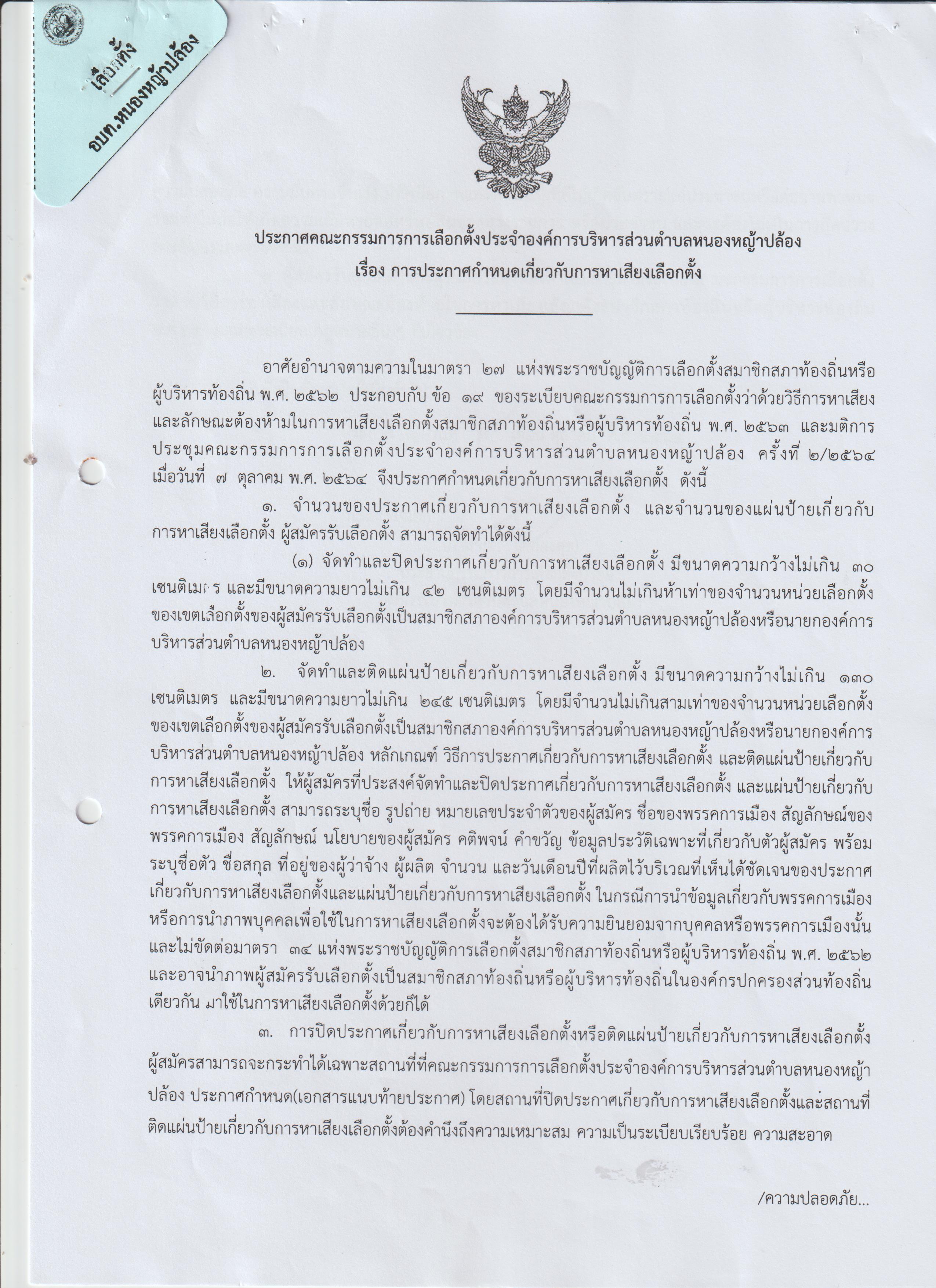 ประกาศคณะกรรมการการเลือกตั้งประจำองค์การบริหารส่วนตำบลหนองหญ้าปล้อง