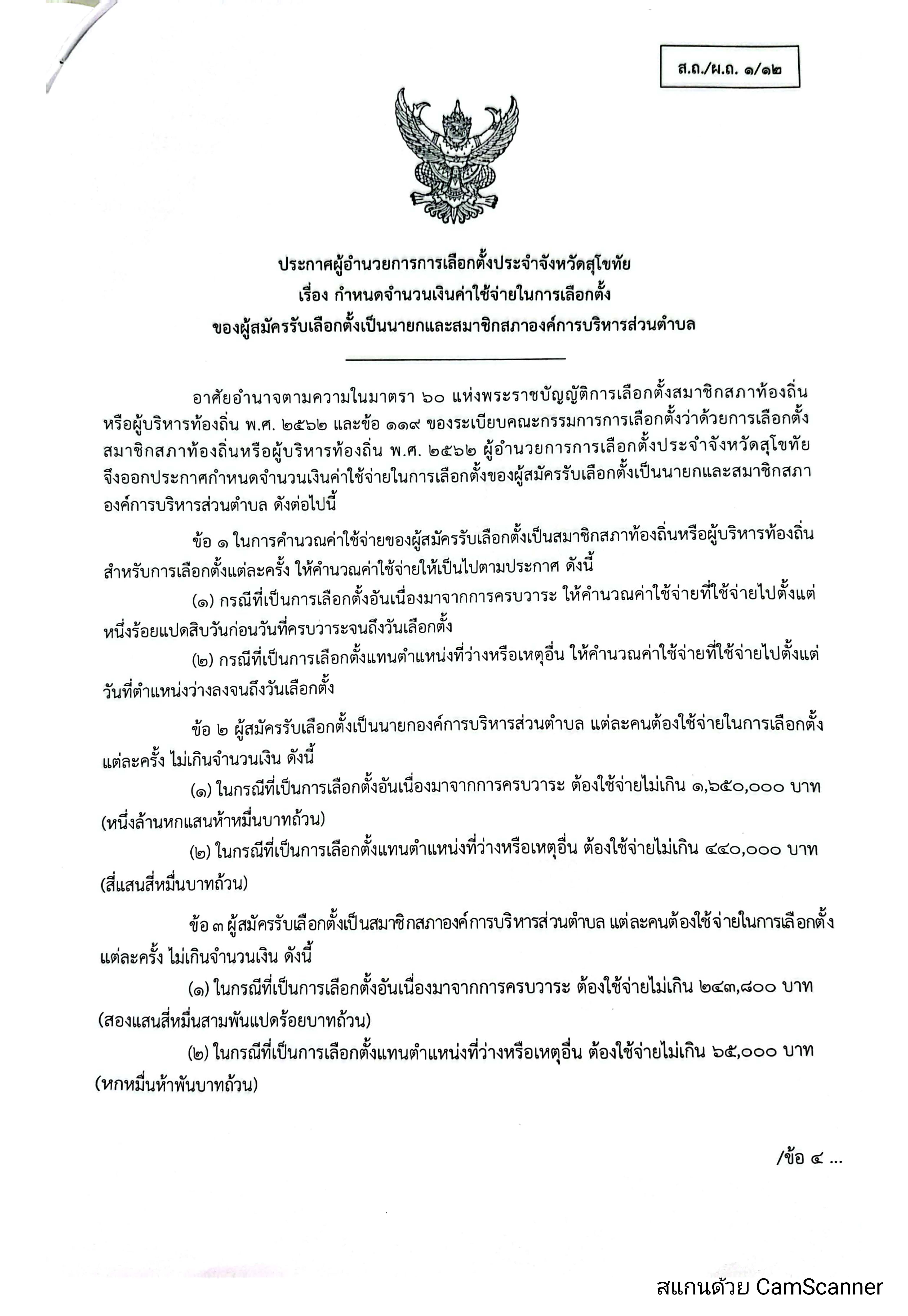 ประกาศผู้อำนวยการการเลือกตั้งประจำจังหวัดสุโขทัย เรื่องกำหนดจำนวนเงินค่าใช้จ่ายในการเลือกตั้งของผู้สมัครรับเลือกตั้งเป็นสมาชิกสภาองค์การบริหารส่วนตำบล